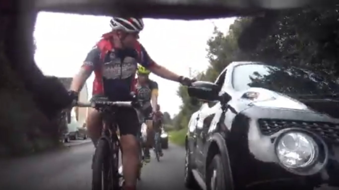 Een groep wielrenners rijdt strak naast elkaar en probeert samen een auto te passeren, precies het soort situatie dat op drukke wegen snel voor wrijving zorgt. Wat in eerste instantie leek op een onhandige inhaalactie escaleert binnen enkele seconden tot iets veel ernstigers.