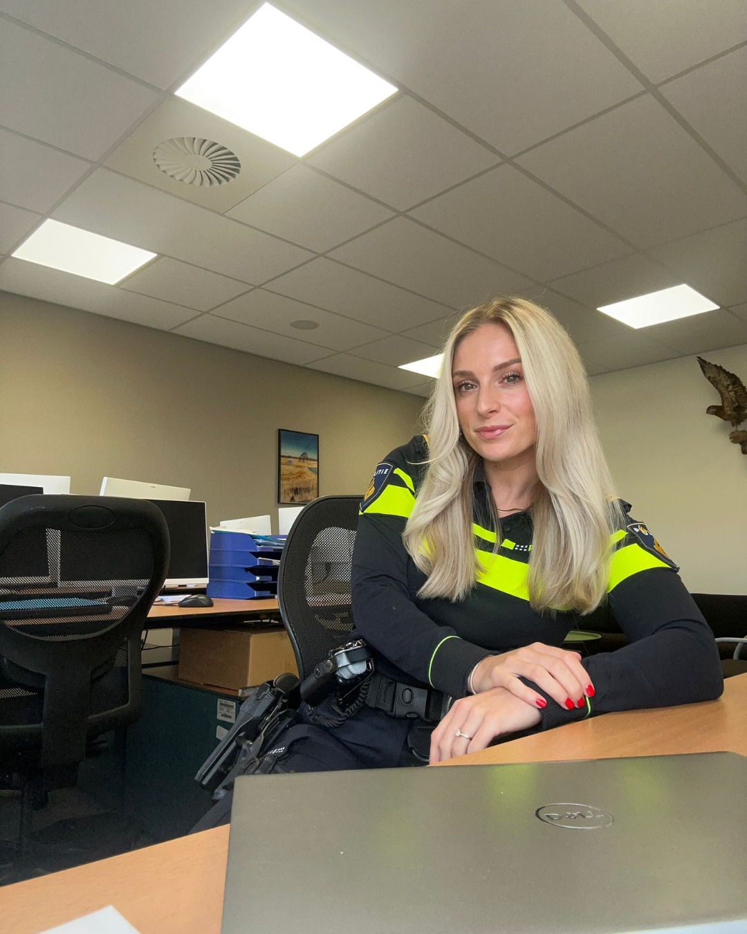 Wat houdt de kantoorfoto van de jonge politieagente die het internet compleet liet ontploffen in?