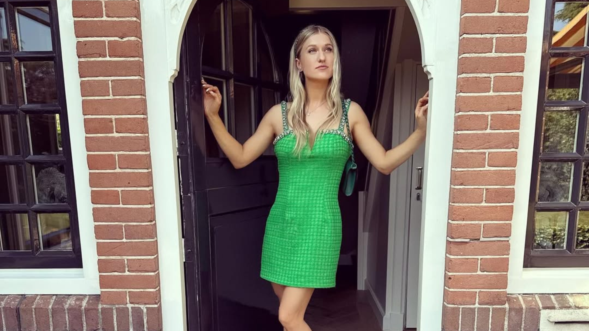 De groene bikini is niet het verhaal, het is het podium. De hoofdrol is weggelegd voor houding en energie. Je hoeft geen stylist te zijn om te snappen waarom dat werkt.