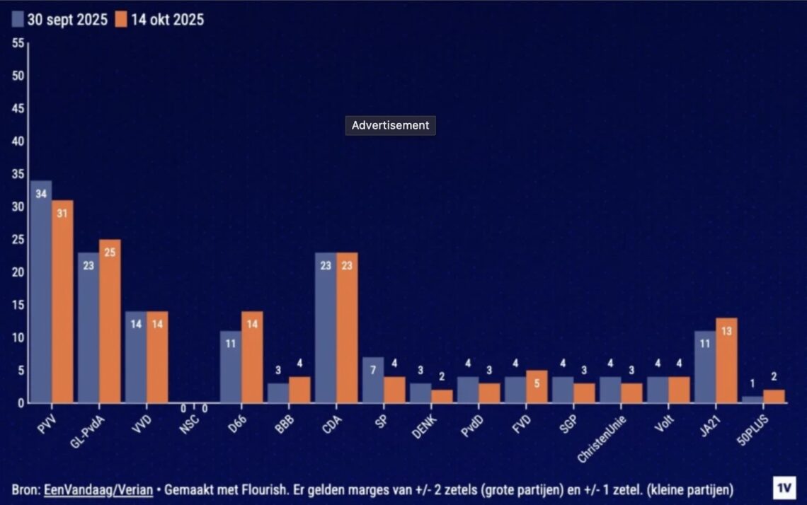 De daling van de PVV, van 34 naar een verwachte 31 zetels, valt binnen normale marges maar laat een aanhoudende trend van verlies zien. Voor een partij die eerder 37 zetels behaalde, is deze aftakeling een punt van zorg, vooral nu de verkiezingen naderen.